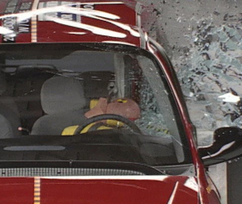 | Driver head protection The dummy's head was hit by the intruding barrier. This hit did not produce high head injury measures, but head impacts with intruding objects such as other vehicles, trees, and poles should be prevented. The high neck injury measures were recorded before the head was hit. |