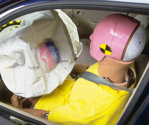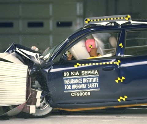 | Driver restraints and dummy kinematics Dummy movement wasn't well controlled. During rebound, the dummy moved toward the driver door. Its head went part of the way out the open window and hit the B-pillar. There was too much upward movement of the steering wheel. |