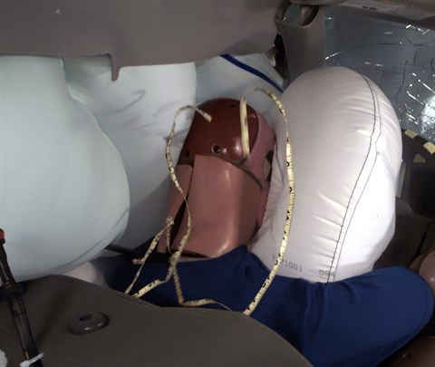 The dummy’s head contacted the frontal airbag but slid off the right side, leaving the head vulnerable to contact with forward structure. The side curtain airbag deployed and has sufficient forward coverage to protect the head from contact with side structure and outside objects. The side torso airbag also deployed.