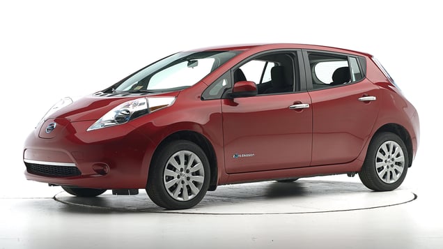 The Nissan Leaf was introduced in the 2011 model year and re-engineered beginning with 2013 models. The car is a plug-in battery-electric vehicle with no gasoline or diesel engine to help power the car. Moderate overlap frontal ratings are assigned by the Institute based on a test conducted by Nissan.