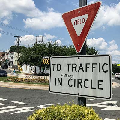 At roundabouts in the U.S., vehicles travel counterclockwise around a raised center island, with entering traffic yielding the right-of-way to circulating traffic. In urban settings, entering vehicles negotiate a curve sharp enough to slow speeds to about 15-20 mph; in rural settings, entering vehicles may be held to somewhat higher speeds (30-35 mph). As vehicles circulate within the roundabout, slow and consistent speeds are maintained by the deflection of traffic around the center island and the relatively tight radius of the roundabout and exit lanes.